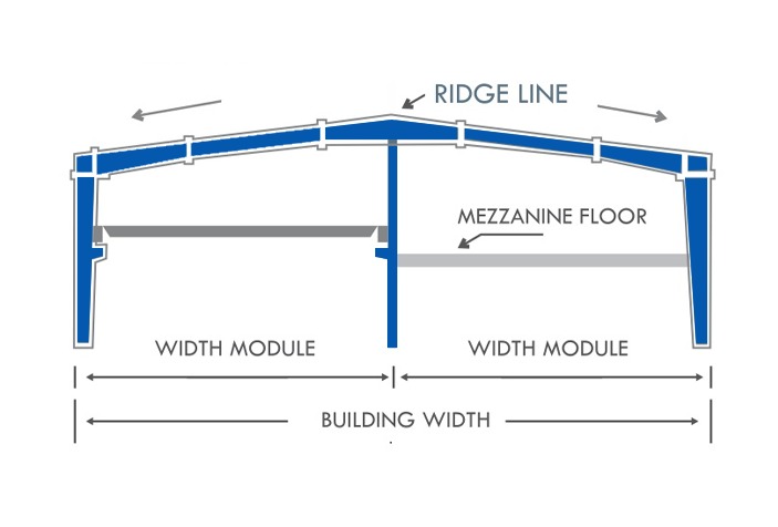 Rigid Frame with EOT Crane in one width module and Mezzanine Floor in other width module.
